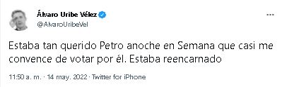 El exmandatario se refirió a la entrevista que tuvo Gustavo Petro con Vicky Dávila y en su cuenta de Twitter señaló que, “estaba tan querido Petro anoche en Semana que casi me convence de votar por él. Estaba reencarnado”. Este comentario tuvo un impacto enorme ya que tras pocos minutos de haber sido publicado, ya contaba con más de 2.300 likes, 800 retweets y más de 600 comentarios.