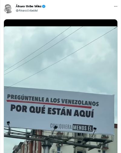 Es una fotografía de una valla, donde no menciona directamente a Gustavo Petro, pero se refiere a lo sucedido en Venezuela y el texto dice: “Pregúnteles a los venezolanos por qué están aquí”, haciendo una referencia al la responsabilidad del gobierno venezolano y cómo este ha hecho que millones de ciudadanos del vecino país tomaran la decisión de marcharse. Más abajo en la valla se puede leer: “Cualquiera menos él”.