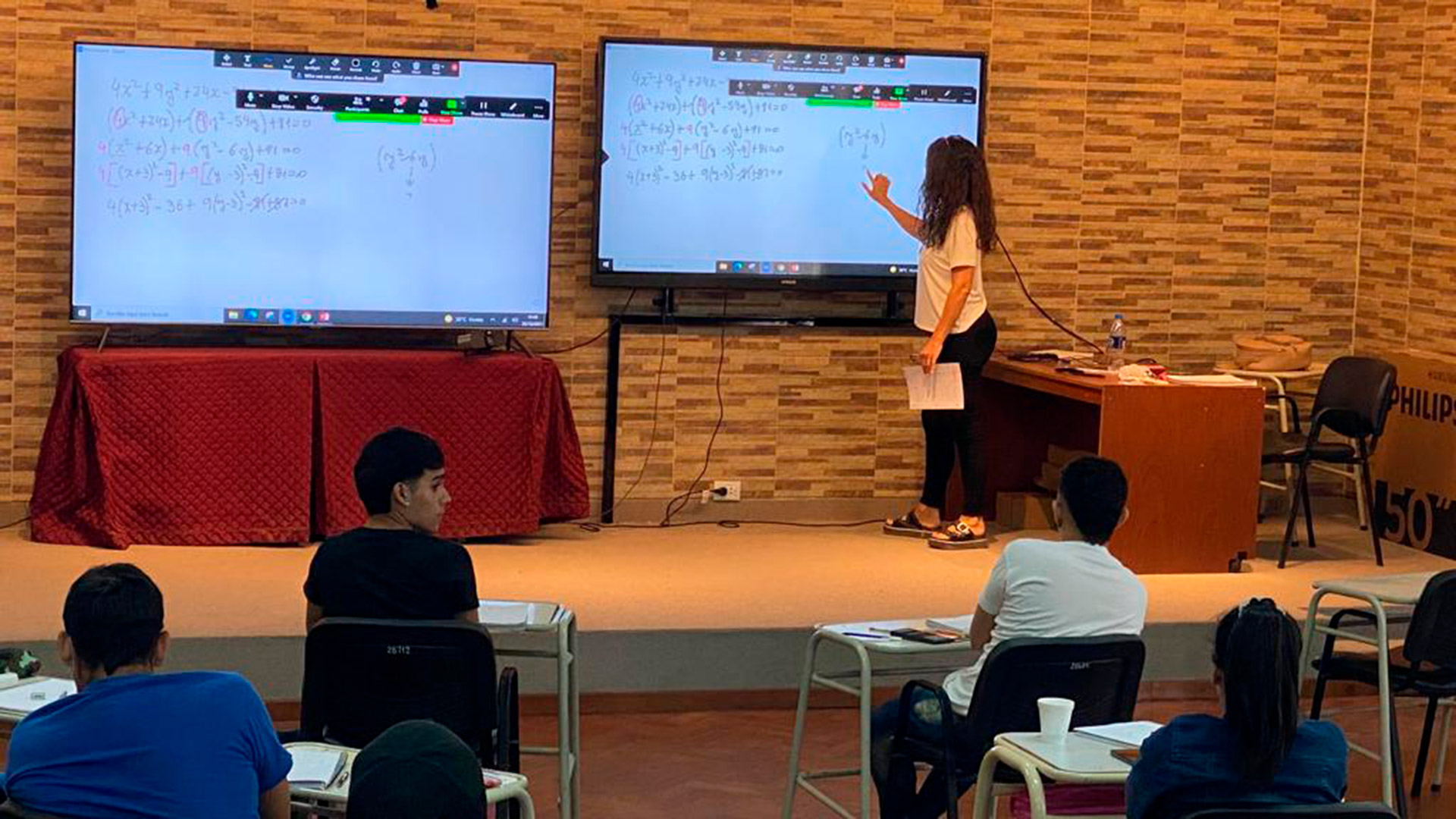 En cuanto al equipamiento, en el salón se instalaron dos pantallas: una pantalla interactiva, para presentar los contenidos de la clase de manera didáctica y entretenida, y otra pantalla aledaña que permitía visualizar a los alumnos y/o docentes que se encontraban participando de la clase de manera remota, a través de la plataforma Microsoft Teams. Además, los docentes que formaron parte de la experiencia híbrida tuvieron que tomar capacitaciones para poder utilizar la tecnología y el equipamiento que se instaló en el aula e incorporar nuevas prácticas pedagógicas que permitieran integrar ambas modalidades de participación.
