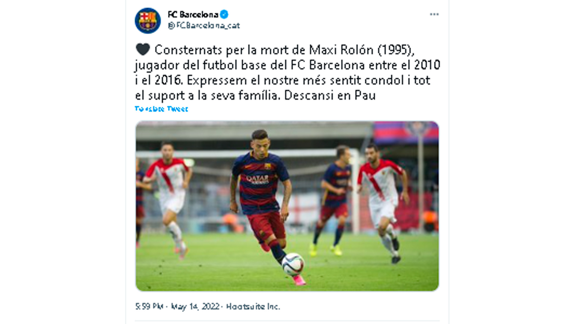 Maxi, de 27 años, había saltado a la fama hace casi una década atrás cuando desembarcó en La Masía del Barcelona. Si bien no llegó a tener minutos en el primer equipo, sí militó dos temporadas en el Barça B y fue clave en la obtención de la primera UEFA Youth League en 2014. El club publicó un comunicado tras enterarse de la noticia: “Consternados por la muerte de Maxi Rolón (1995), jugador del fútbol base del FC Barcelona entre 2010 y 2016. Expresamos nuestro más sentido pésame y todo el apoyo a su familia. Descanse en Paz”.