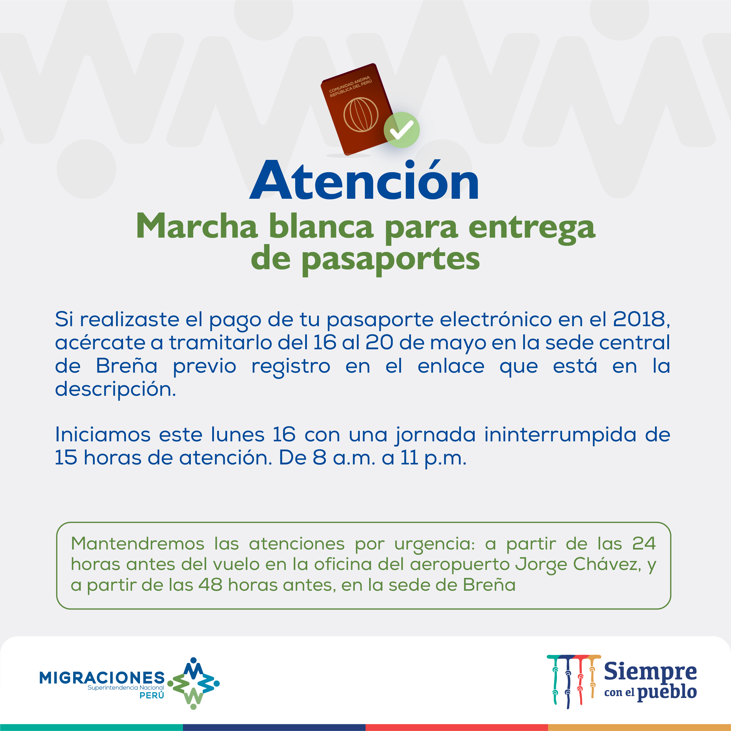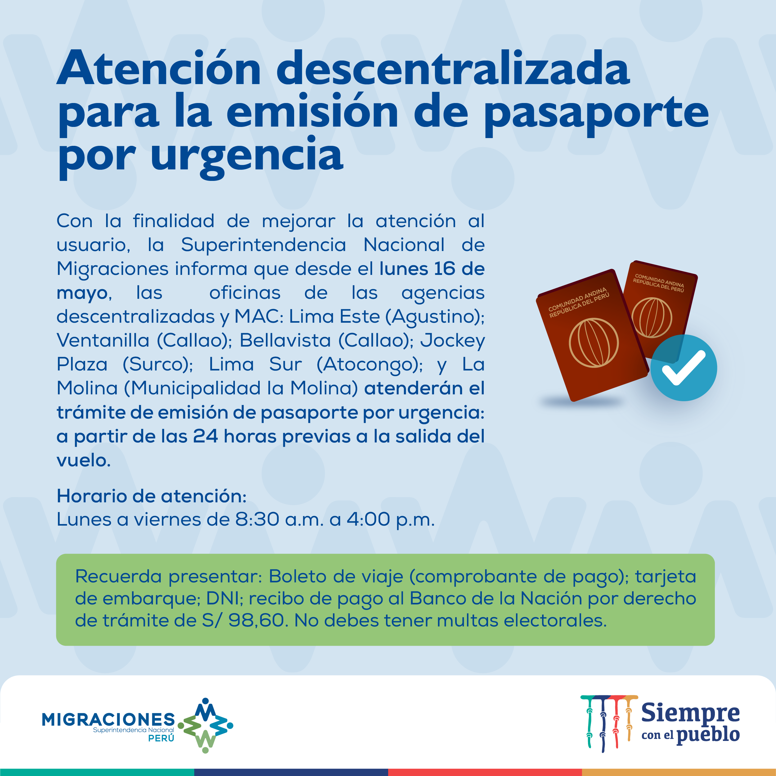 En un comunicado, la Superintendencia Nacional de Migraciones indicó que desde hoy 16 de mayo, las oficinas de las agencias descentralizadas y MAC: Limas Este (El Agustino), Ventanilla, Bellavista, Jockey Plaza, Lima Sur (Atocongo) y La Molina atenderán el trámite de emisión de pasaporte por urgencia a partir de las 24 horas previas a la salida del vuelo, en el horario de lunes a viernes de 8:30 a.m. a 4:00 p.m.