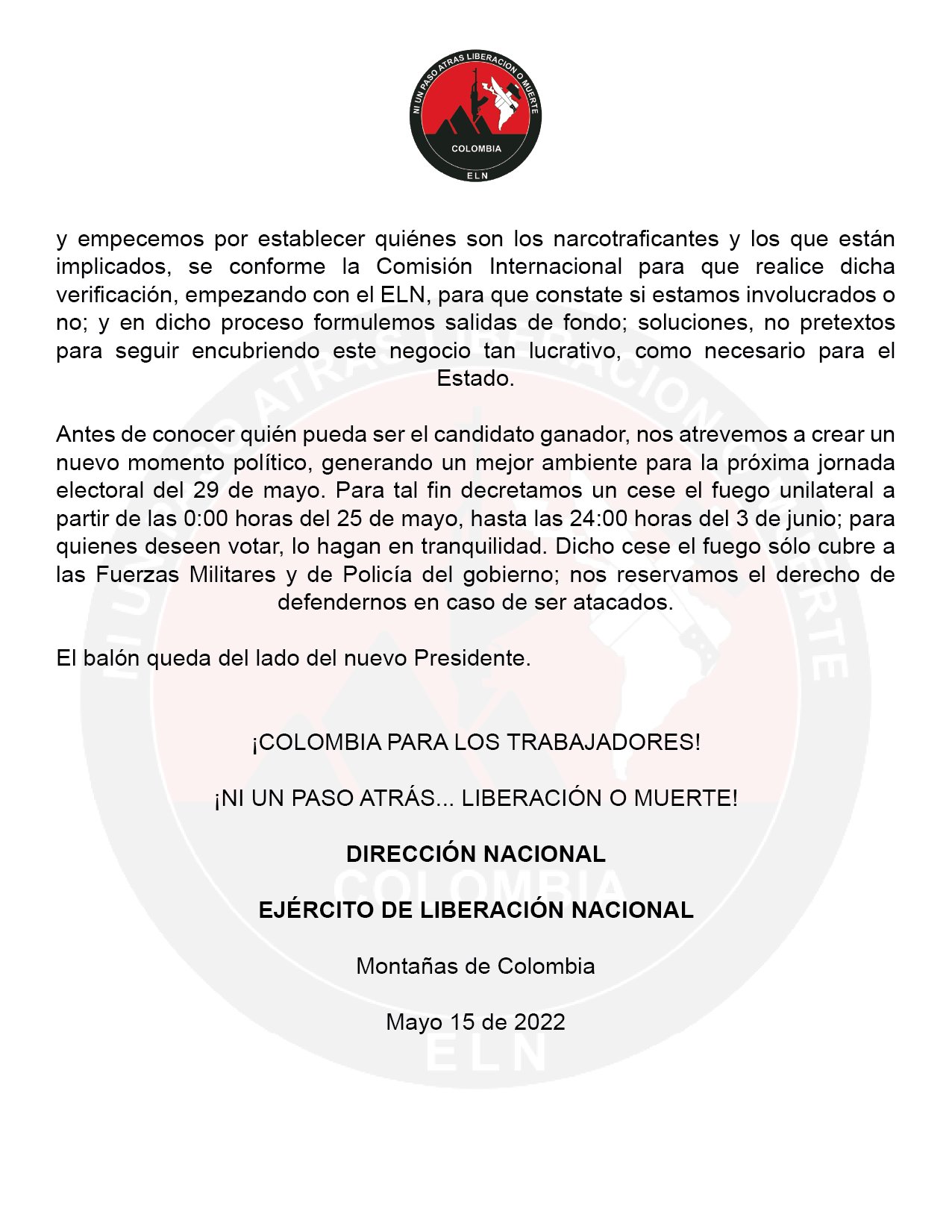 Además, el grupo armado señaló que está dispuesto a entablar nuevas conversaciones con el Gobierno Nacional cuando se conozca al nuevo presidente de la República: “El Ejercito de Liberación Nacional está dispuesto a reanudar diálogos con el gobierno del Presidente que resulte electo en las próximas jornadas electorales”.