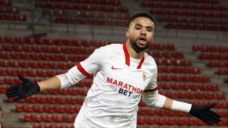 FOTO DE ARCHIVO: El futbolista Youssef En-Nesyri celebra tras marcar un gol para el Sevilla en el partido de Liga de Campeones que enfrentó a su equipo con el Stade Rennes en el estadio Roazhon Park de Rennes, Francia, el 8 de diciembre de 2020. REUTERS/Stephane Mahe