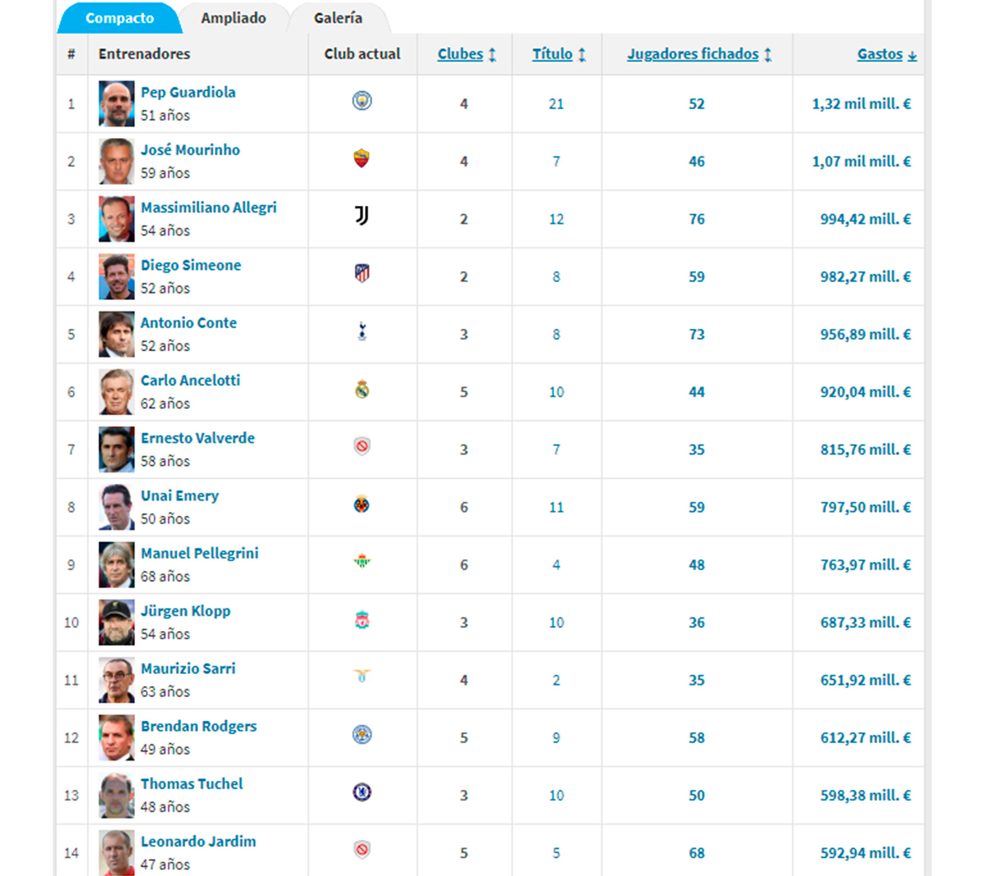 LA TABLA DE LOS ENTRENADORES QUE MÁS DINERO GASTARON EN FICHAJES