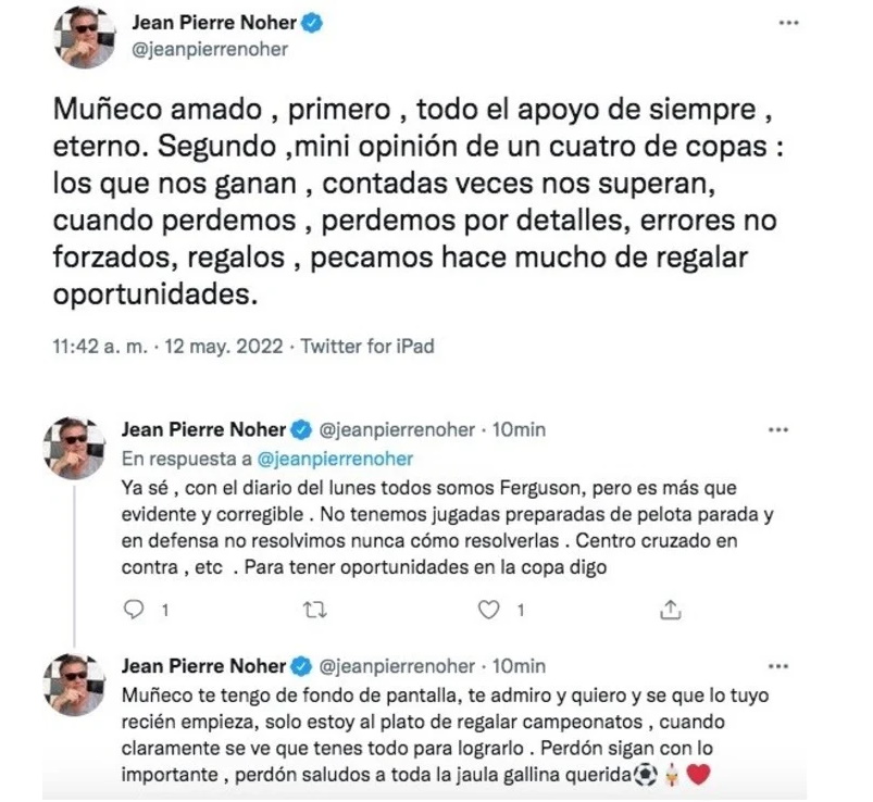 “Muñeco, te tengo de fondo de pantalla, te admiro y quiero, y sé que lo tuyo recién empieza, solo estoy al plato de regalar campeonatos, cuando claramente se ve que tenés todo para lograrlo. Perdón sigan con lo importante, perdón… saludos a toda la jaula gallina querida”, finalizó Pierre Noher.