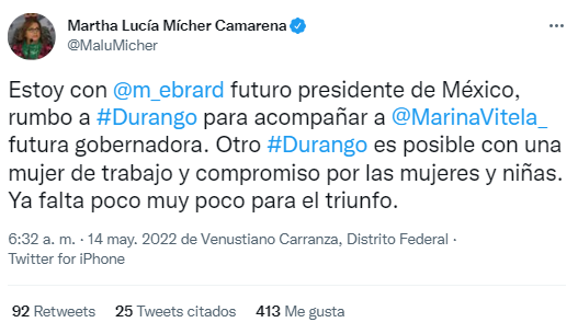 Mediante su cuenta de Twitter, Mícher Camarena escribió: “Estoy con @m_ebrard futuro presidente de México, rumbo a #Durango para acompañar a @MarinaVitela_ futura gobernadora. Otro Durango es posible con una mujer de trabajo y compromiso por las mujeres y niñas. Ya falta muy poco para el triunfo”.