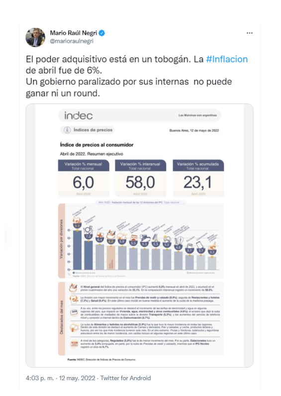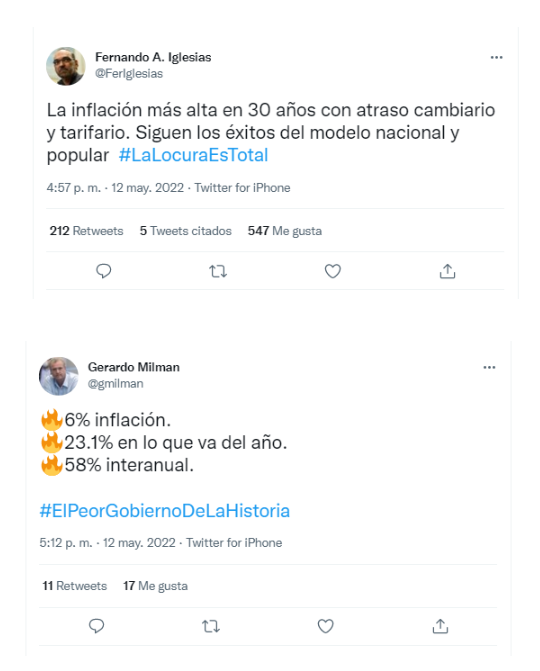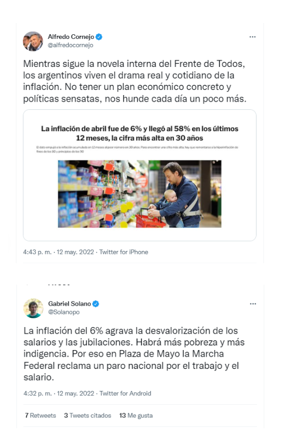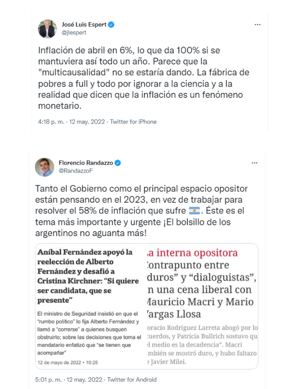 Tras la difusión del 6% de inflación en abril y, como consecuencia de eso, el registro del índice de costo de vida anualizado más alto en tres décadas, dirigentes de todos los sectores de la oposición cuestionaron con dureza al gobierno de Alberto Fernández y Cristina Kirchner. La caja de resonancia fue la red social Twitter, donde los cuestionamientos apuntaron a los magros resultados de la gestión económica para frenar los aumentos de precios.