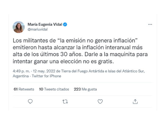 Desde Juntos por el Cambio, también hablaron María Eugenia Vidal y Mario Negri: “Los militantes de “la emisión no genera inflación” emitieron hasta alcanzar la inflación interanual más alta de los últimos 30 años. Darle a la maquinita para intentar ganar una elección no es gratis”, expresó la legisladora, mientras que su colega por la provincia de Córdoba agregó que “el poder adquisitivo está en un tobogán. La #Inflacion de abril fue de 6%. Un gobierno paralizado por sus internas no puede ganar ni un round”.