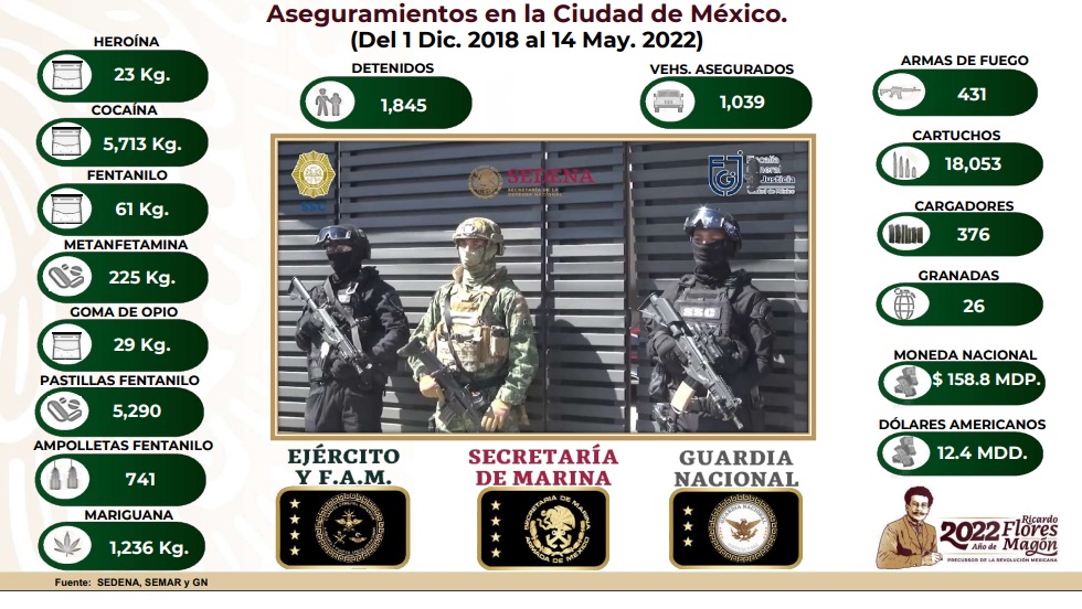 1 de diciembre de 2018 y hasta el 14 de mayo de 2020, las fuerzas federales han incautado 5 mil 713 kilos de cocaína y mil 236 kg de marihuana.