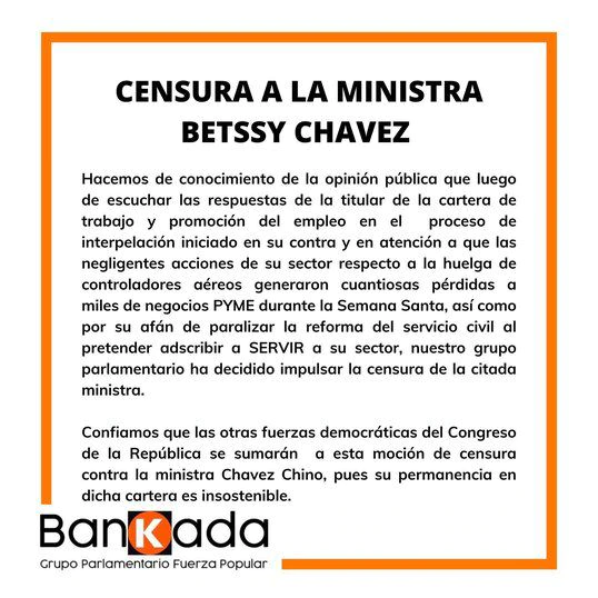 “Hacemos de conocimiento de la opinión pública que luego de escuchar las respuestas de la titular de la cartera de trabajo y promoción del empleo en el proceso de interpelación iniciado en su contra y en atención a que las negligentes acciones de su sector respecto a la huelga de controladores aéreos generaron cuantiosas perdidas a miles de negocios PYME durante la Semana Santa, así como por su afán de paralizar la reforma del servicio civil al pretender adscribir a SERVIR a su sector nuestro grupo parlamentario ha decidido impulsar la censura de la citada ministra”, se lee en el documento.
