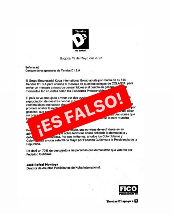 Se trata de una supuesta carta en la que la empresa anunciaba que le daría un descuento de hasta el 70% a los que votaran por el candidato del Equipo por Colombia Federico Gutiérrez.