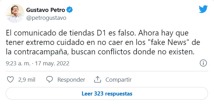 “El comunicado de tiendas D1 es falso. Ahora hay que tener extremo cuidado en no caer en los “fake News” de la contracampaña, buscan conflictos donde no existen”, indicó el líder del Pacto Histórico.