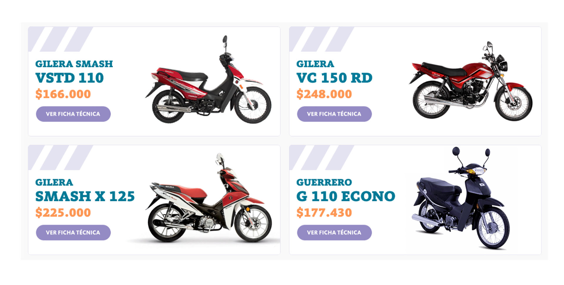 Otros modelos disponibles son: la Bajaj Boxer AT, que tiene un precio de venta en la tienda BNA de $299.990; la Corven Energy Base, cuya cotización es de $172.796; la Brava Nevada Base, a $172.900; y la Gilera Smash Full, a $188.000. También se pueden conseguir la Guerrero G 110 Econo, a $177.430 y la Keller Classic 110, a $164.226.