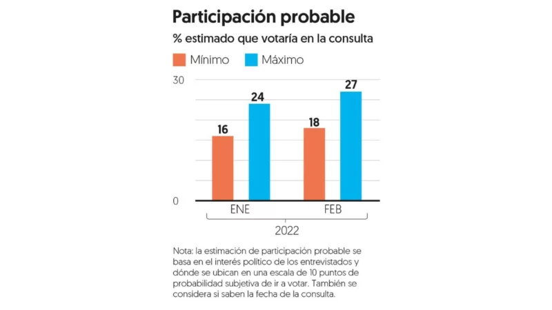 De acuerdo con una encuesta realizada por El Financiero, la intención de los ciudadanos por participar en la consulta de revocación de mandato impulsada por el presidente Andrés Manuel López Obrador, registró un aumento de 3 puntos porcentuales de enero a febrero.