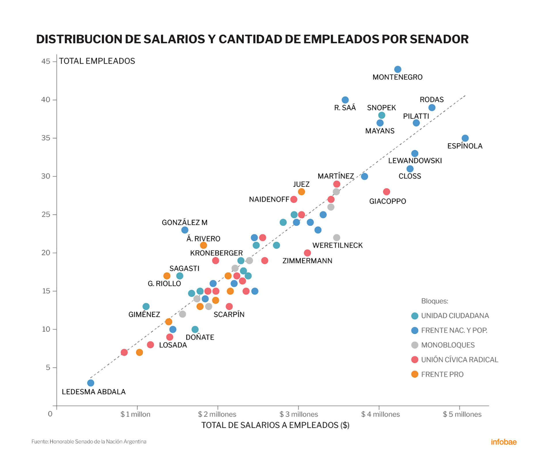 “Si bien cada senador tiene una cantidad de módulos fija, luego hay otras variables, como si es autoridad de bloque o presidente de comisión, por ejemplo, que modifican esa situación de paridad. Los senadores también cuentan con los empleados de planta, tanto permanente como transitoria, que son adjudicados a través del bloque o de la cámara. Cada senador, entonces, puede armar su propio esquema”, sostuvo Noel Alonso Murray, directora ejecutiva de Directorio Legislativo.