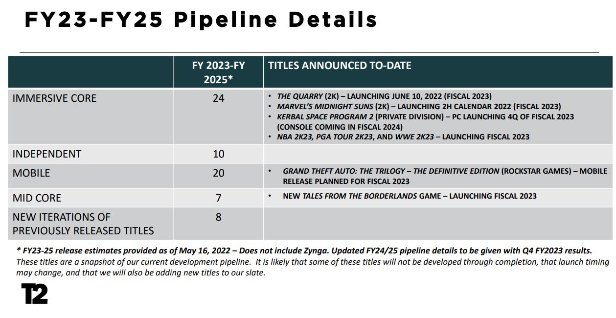 Los detalles de su reporte revelaron también que en total existen planes para 24 proyectos principales (entre los que se encuentran The Quarry, NBA 2k23 y Kerbal Space Program 2), siete proyectos intermedios (como New Tales from the Borderlands), 20 juegos para celular y otros 10 juegos de sus estudios indie no especificados.