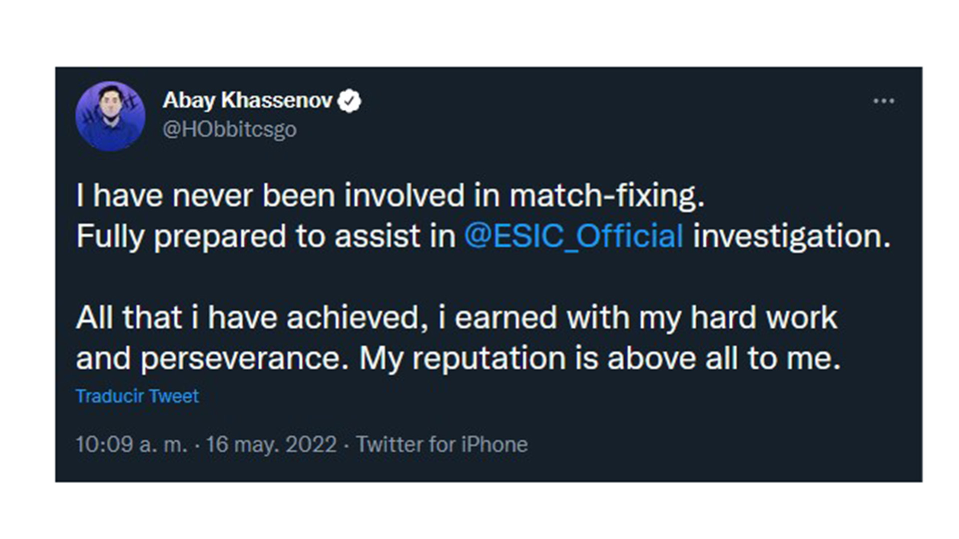 Horas después del reporte, el jugador de Cloud9 escribió un descargo en Twitter y negó las versiones que se difundieron: “Nunca he estado involucrado en arreglo de partidos. Estoy totalmente preparado para asistir en la investigación del ESIC. Todo lo que he logrado, lo conseguí con trabajo duro y perseverancia. Mi reputación está por sobre mi”.