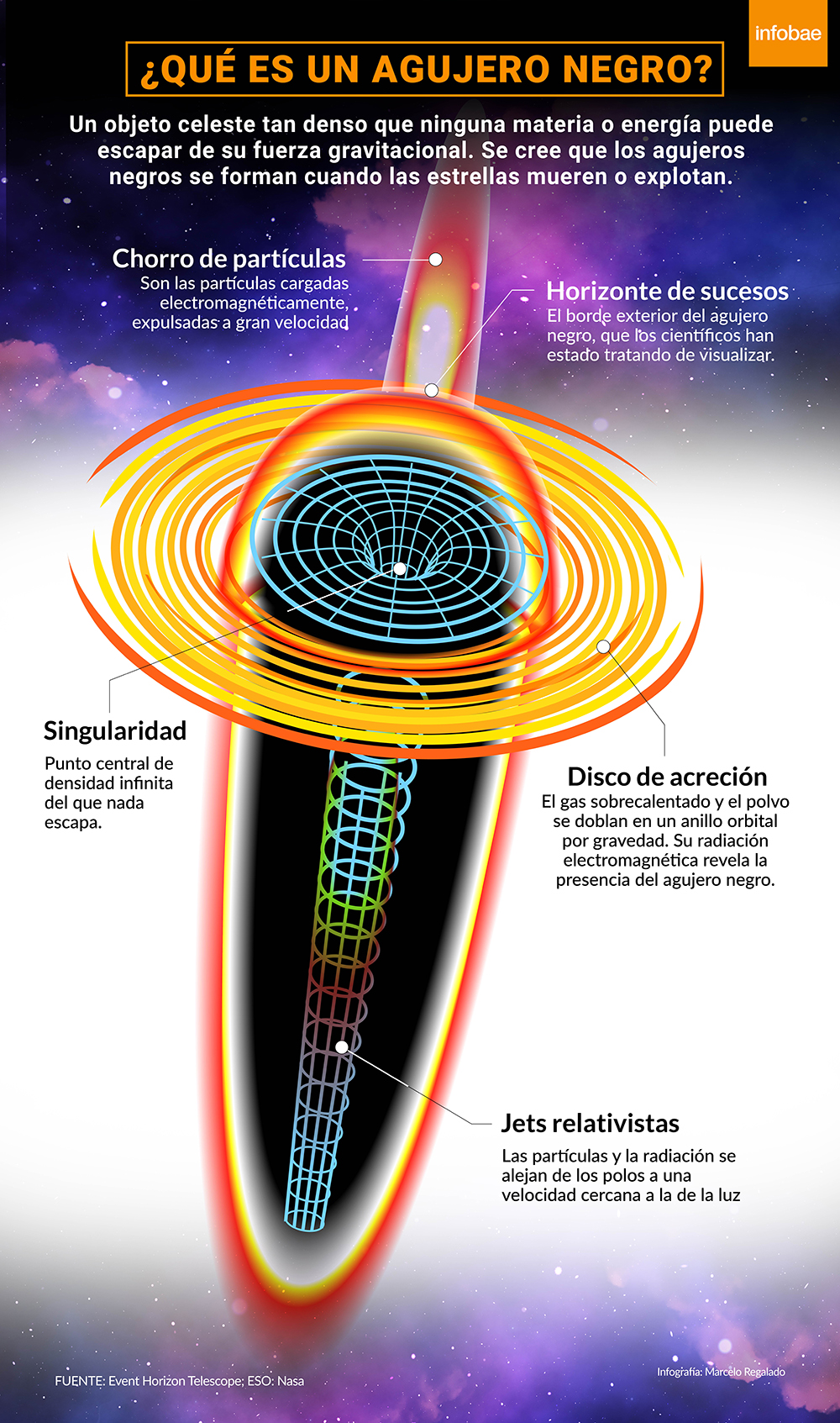 Los astrónomos creen que casi todas las galaxias, incluyendo la nuestra, tienen agujeros negros gigantescos en su centro, de donde no pueden escapar la materia ni la luz, por lo cual es sumamente difícil captar imágenes de ellos. Según explicaron los expertos, la gravedad curva y retuerce caóticamente la luz cuando ésta se sumerge en ese abismo de gas y polvo supercalentados que forma el agujero negro.